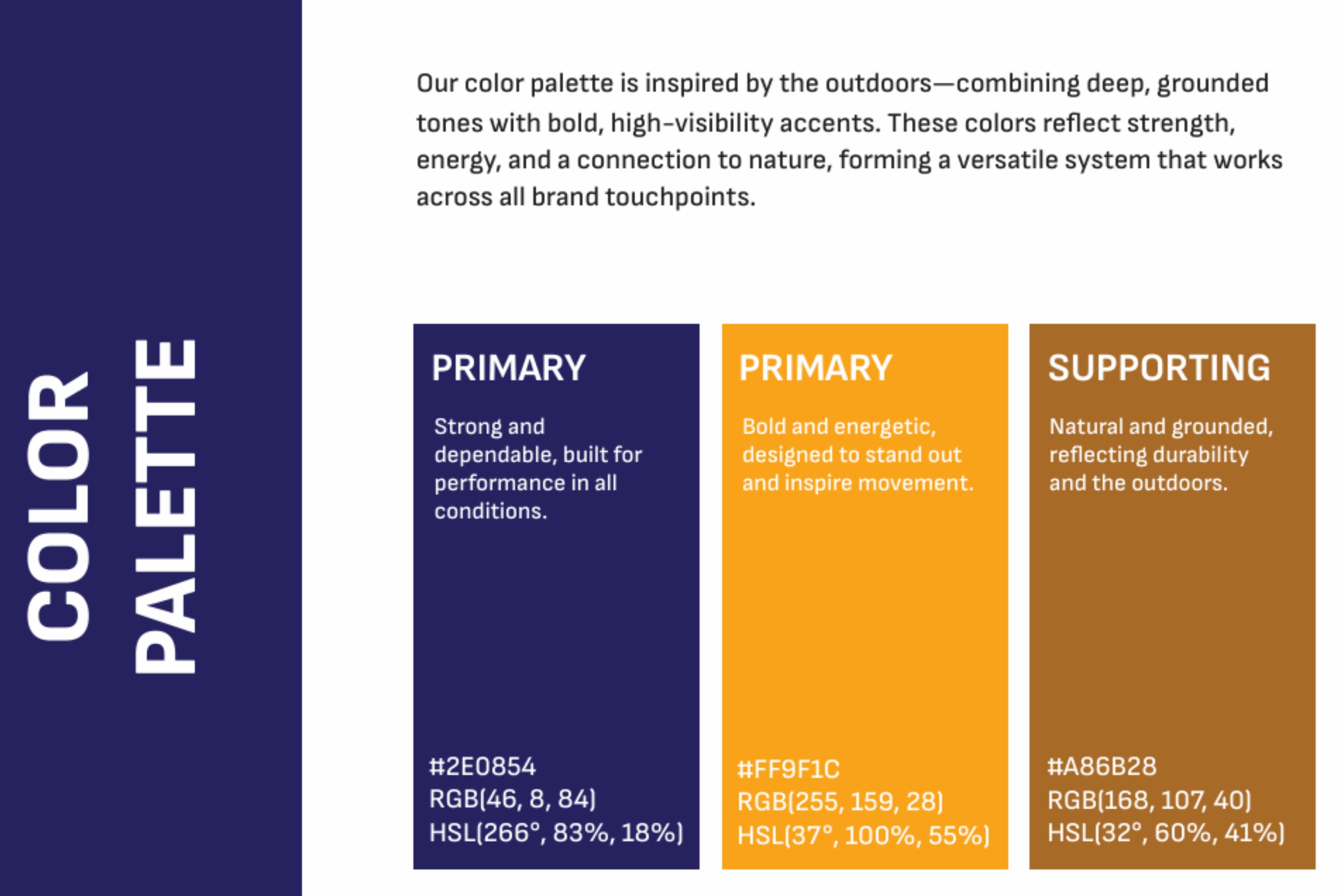 A nature-inspired palette combining deep tones with bold accents to reflect strength and outdoor energy.