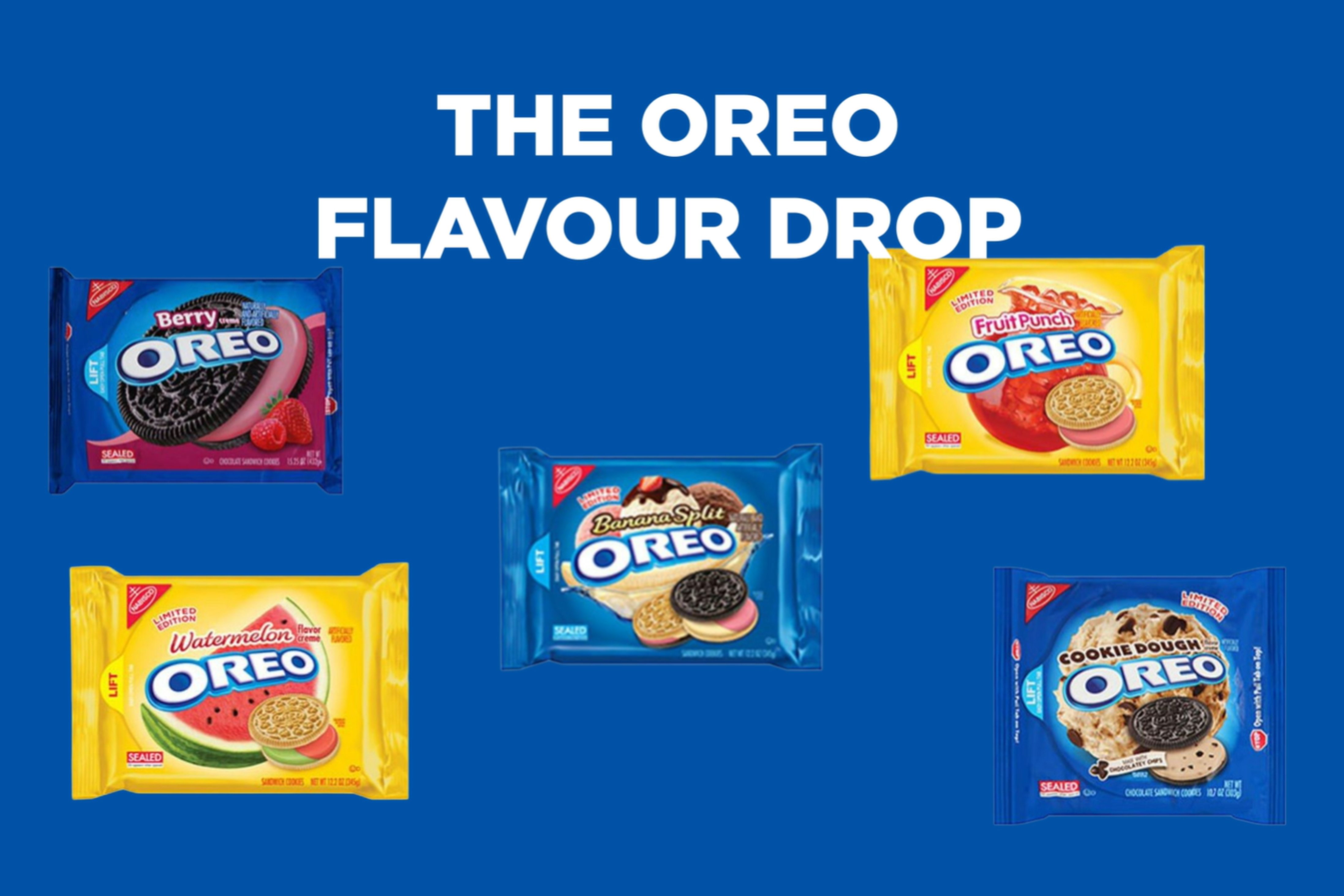 Displays multiple Oreo flavors and variations with visually appealing transitions and compositions.